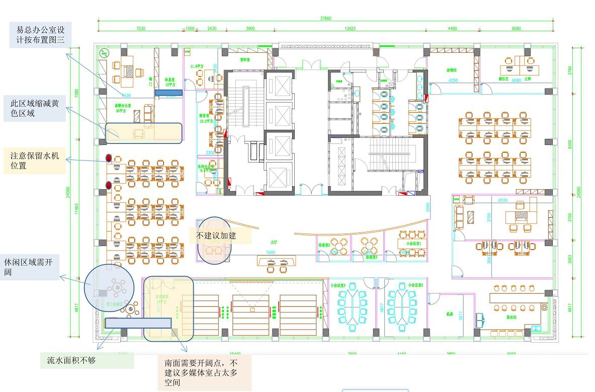 1、南面和西面是公司比较关键的方位,尤其是南面,需要开阔,所以多媒体室不要占用流水池的面积,需要把那块完全空出来,流水池和员工休息区空间要留宽敞;