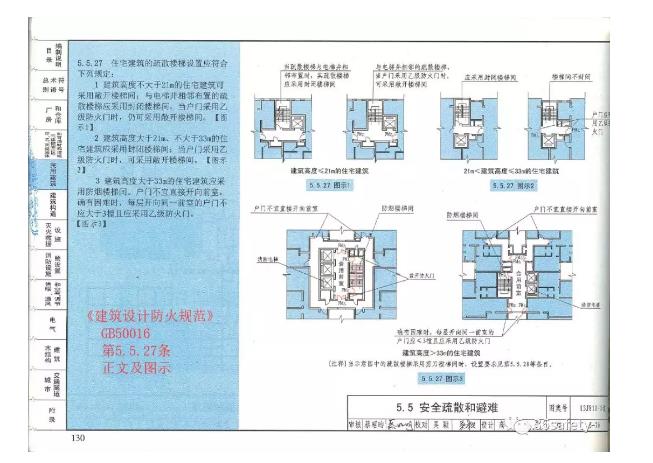 注:在2018版《建筑设计防火规范》图示中,对于住宅部分的图示,新增了很多内容。本篇中主要讲解的是33米及以下的住宅楼梯形式,此部分内容中引用的5.5.27条图示1,5.5.27条图示2,在新老图示中,内容一致,无变化。